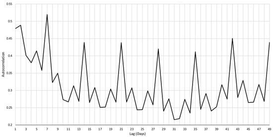 Starting from the observations in Reference [14], we looked for temporal regularities in the data considering a temporal granularity at a day level. More in detail, we used the autocorrelation operator to detect recurring patterns for each road segment. This operator is used to evaluate at which lag a signal is maximally similar to itself. In presence of periodic dynamics, the autocorrelation plot will show strong local peaks, corresponding to lags at which the signal has a high recurrence. In our analysis, we searched for lags in a range from one day up to half the days available in each considered data collection period. This is to keep the number of superimposing samples sufficiently high to obtain reliable autocorrelation values. As an example, Figure 1 shows the plot of the average autocorrelation values for all road segments in San Francisco during Period 3. The spikes due to the recurring patterns at 7 days lag are clearly visible in the autocorrelation curve, indicating that the on-street parking phenomenon has a recurring dynamic with a period of one week.