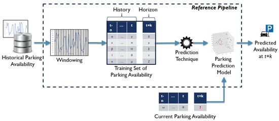 Many solutions presented in the on-street parking prediction literature use a pipeline like the one shown in Figure 6 [9,10,13,35]. In detail, a dataset of historical parking availability contains the examples to train a supervised predictive model. Depending on the employed prediction technique, for each road segment, the dataset is windowed to generate a set of records, that is, the features for the regressor, containing a sequence of parking availability information in the time interval , , referred to as history in the rest of the paper.