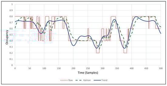 In this work, we use the same configuration of the Kalman filters we described in Reference [36] to compensate the problem that, in the case of on-street parking, raw observations are affected by random events that end up masking the underlying dynamics of street segments. The filter uses, for each road segment, the total number of parking spaces to estimate the Gaussian falloff of the true state probability space, centred on the last observation. To estimate the transition covariance matrix using the dynamics of each road segment, as observed in the training set, we introduce use the Expectation-Maximisation approach. The parameters are then used, using a sliding windows approach, to simulate online state estimation with a Kalman filter on each road segment. The reader is referred to Reference [36] for more details about the Kalman filters configuration. An average RMSE of 0.05 between the Kalman curve and the trend curve was obtained on the dataset and an example comparison of the three curves is presented in Figure 7.