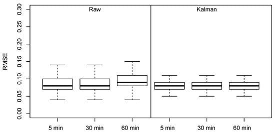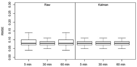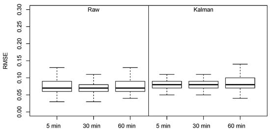 The results of the two baseline prediction approaches are reported in Table 1, together with the RMSE, Entropy and F metrics, while the boxplots summarising the performance obtained with these configurations are shown in Figure 8. From these numbers, we can see that raw and smoothed solutions are very close in terms of RMSE. The introduction of Kalman filters reduces Entropy when using 5 min of historical data, and increase it at 60 min.