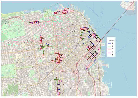 The application of the hierarchical clustering produces the dendrogram presented in Figure 9, with an automatically computed value of 5 as the number of recommended clusters, following the criterion described in Section 4. Figure 10 shows the clusters distribution over the map of San Francisco provided by OpenStreetMap: while spatial patterns can still be observed, as it is to be expected, the image shows that similar temporal dynamics can occur in different parts of the city, highlighting that the same trained model can be used to manage spatially distant road segments.