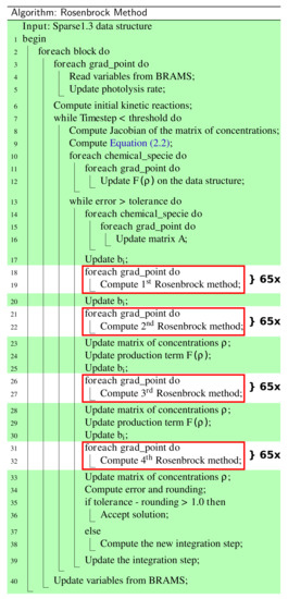 These online chemistry models must combine implementation aspects related to spatial resolution, simulation length, and degree of complexity of the chemical mechanism. As such, fine-grained resolution, large domains, and detailed chemistry are infeasible in long production runs due to its associated computing costs. In BRAMS, the chemical reaction model is a stiff problem solved by the Rosenbrock method as depicted by the pseudocode in Figure 1. This code reflects an implementation with 65 columns, corresponding to 65 3D columns in the partition of the physical space and are used for concurrency management purposes.