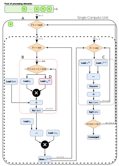 In Figure 2, we show our block diagram for Jacobi single sparse. Regarding loop pipelining, the single linear solve kernel executes multiple rows in flight. Not all loops can be executed in a pipelined fashion, as is the case with the outermost loop (A), for controlling the algorithm’s iterations.