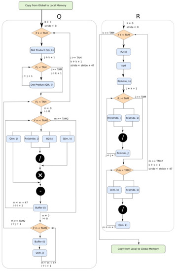 In the first optimization (QR + SR), we used shift registers to improve pipeline parallelism and remove data dependency on the multiply-accumulate inherited from the dot product operation. In a second optimization (QR + SR + LM), we removed the use of global memory during QR decomposition, that is, computations are performed with data residing in the local memory.