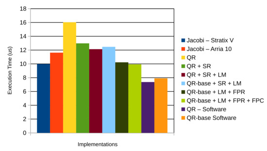 We also noticed that the C implementation of QR-base (presented in Algorithm 2) does not perform as well in CPU. It is slower than the best software implementation of QR (presented in Algorithm 1). This slower performance is related to the number of loops in the QR-base algorithm—The version represented as QR-base-Software .