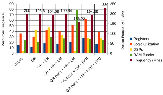 - Parker, M.; Mauer, V.; Pritsker, D. QR decomposition using FPGAs. In Proceedings of the 2016 IEEE National Aerospace and Electronics Conference (NAECON) and Ohio Innovation Summit (OIS), Dayton, OH, USA, 25–29 July 2016; pp. 416–421. [Google Scholar]