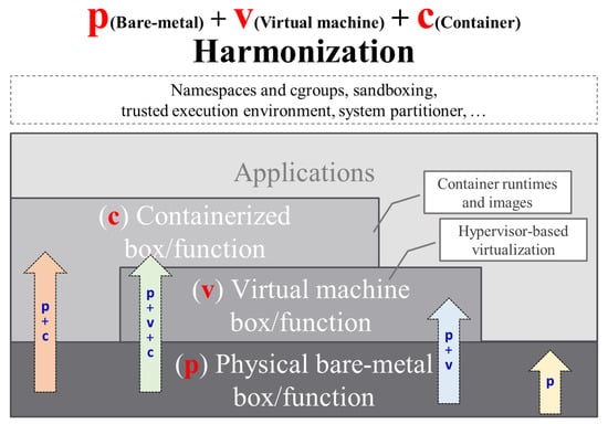 Figure 2. The concept of p (physical) + v (virtual) + c (container) harmonization. - R2 (Requirement 2). Supporting multiple networks for flexible and reliable composition: For flexible and reliable composition from distributed clusters, a composable playground should support multiple networking connectivity within, as well as between clusters, while properly limiting the access of developers. Typical DevOps services can generate control traffic in addition to service data traffic for efficiency, reliability, and security. A composable playground should provide multiple networks for tenants to match this traffic to playground networks effectively. Meanwhile, heavy workloads and any incidents incurred from multiple tenants, especially in networks, and over shared clusters can result in failures of operations, as well as incorrect results of DevOps services. Thus, for a composable playground, SmartX Playground should separate operational traffic from service traffic.