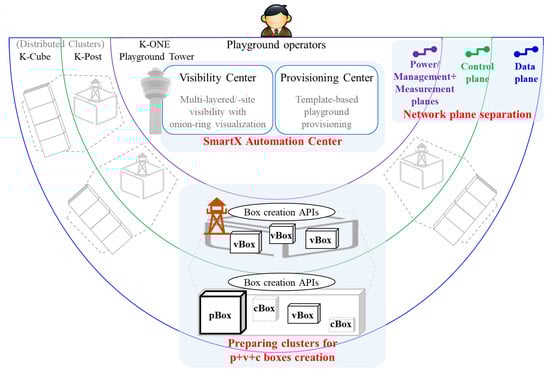 Among the related work, the Smart Applications on Virtual Infrastructure (SAVI) testbed [] has a similar approach to K-ONE Playground, in terms of the research domains and resources given to tenants. The SAVI testbed is a multi-tier heterogeneous cloud testbed that consists of federated core/edge clouds, WiFi access points, and IoT things. The testbed also includes a centralized software framework that can be similar to SmartX Automation Centers, and the framework utilizes an Ansible-based provisioning tool and visibility tool in order to configure, monitor, and visualize the overall testbed automatically. Furthermore, the authors also considered leveraging Kubernetes-based cloud-native computing for containerizing management services such as OpenStack components, OpenFlow controller, and other operational services. As shown above, the SAVI testbed and K-ONE Playground have many similar points, but our work focuses more on suggesting an easy and unique design for constructing a cloud-native-ready testbed where an operator and developers can enjoy the features of reconfigurable clusters. Furthermore, tenants of K-ONE Playground can intuitively map their topology of cloud-native clusters and even freely manipulate physical and virtual boxes.