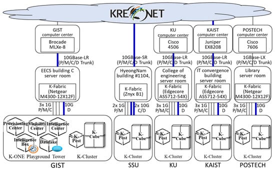We constructed resource infrastructure by deploying hardware implementations of K-Cluster at five universities in South Korea (i.e., GIST (Gwangju Institute of Science and Technology), KU (Korea University), SSU (Soongsil University), POSTECH (Pohang University of Science and Technology), and KAIST (Korea Advanced Institute of Science and Technology)). To inter-connect the distributed clusters, the clusters were physically attached to KREONET (Korea Research Environment Open NETwork), which can support 10Gbps-capable wide area networks over South Korea. To configure K-ONE Playground Tower, we installed additional physical servers at the GIST site, which were exclusively used for SmartX Automation Centers.