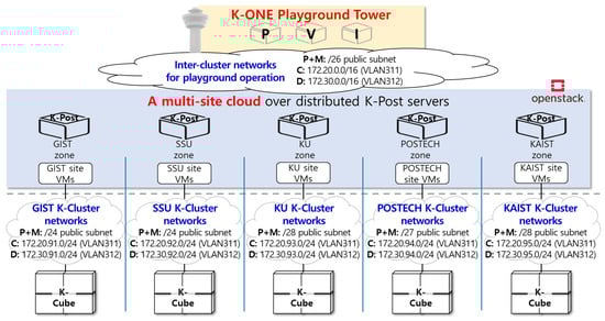 In addition to the intra-cluster networks, we additionally configured special L2 networks between the K-Post servers and K-ONE Playground Tower servers as we mention in Section 4.1. These L2 networks inter-connect the clusters through multiple networking planes and support to construct a cloud over the K-Post servers. For the inter-cluster networks, we configured an additional public subnet for the P + M planes. The inter-cluster C and D planes were configured as IP supersets of the intra-cluster C and D planes of all distributed clusters, due to the requirements of the OpenStack configuration.