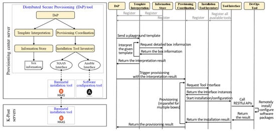 The latest version of the DsP tool supports two Interfaces for Canonical MAAS and Red Hat Ansible [], as also described in Figure 7. We deployed the DevOps tools, MAAS region controller, and Ansible as system containers in the Provisioning center to prevent software conflicts between these tools. When it comes to MAAS, we deployed cluster controllers of MAAS to the respective K-Post servers as virtual boxes to distribute operation workloads from the centralized Tower servers. The region controller in the Provisioning center provides a web-based dashboard and RESTful interfaces, and the cluster controllers conduct actual installation tasks of physical boxes using IPMI and PXE booting. In addition to MAAS, we utilized Ansible to compose virtual boxes, as well as to install software packages by leveraging its versatile features. That is, composing and releasing virtual boxes were implemented as Ansible playbooks, which describe the detailed steps of software configurations for Ansible to automate provisioning procedure.