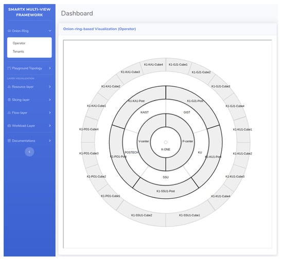 SmartX MVF can provide multi-layered visibility of the overall playground with an onion-ring visualization dashboard [,,,,]. The onion-ring dashboard of SmartX MVF was originally adapted to OF@TEIN Playground, which had a fixed playground topology of distributed physical servers with pre-installed multi-region clouds for SDN-cloud DevOps services [,]. Unlike OF@TEIN Playground, the reconfigurable clusters consider the multi-site edge cloud model and can frequently change the playground topology. Thus, to visualize the reconfigurable clusters intuitively, we should implement another version of the onion-ring visualization dashboard, as shown in Figure 4. The dashboard can initially depict distributed clusters as a big mass of available resource boxes, which is the grey-colored areas. When we compose boxes for tenants, the boxes can be visualized as partial rings divided by lines on the resource mass. Therefore, we can easily identify unused resources, as well as allocated resources from Visibility center.