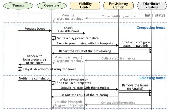 To verify the feasibility, we measured the elapsed time to reconfigure the playground topology with an example scenario. In this scenario, we assumed that two tenants demanded to acquire boxes with different playground topologies. The first tenant demanded four physical boxes from two sites and two virtual boxes inside the created physical boxes. Thus, we composed four physical boxes from two sites, installed two OpenStack-based clouds, and composed two virtual boxes from these clouds. After finishing the tenant’s development, we released the physical boxes. Next, another tenant demanded two virtual boxes in two K-Post servers, so we composed and released these virtual boxes from the cloud over the K-Post servers.