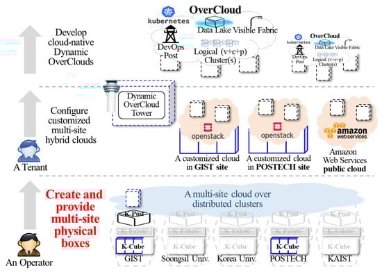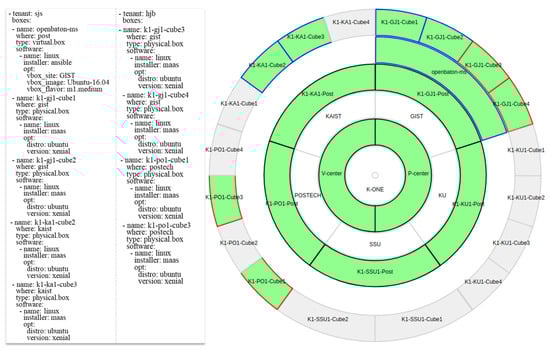 A playground template describes the desired playground topology: three physical boxes from the GIST cluster, three physical boxes from the POSTECH cluster, and a virtual box from a K-Post server. The Provisioning center with the DsP tool installs operating systems for the selected physical boxes and instantiates a virtual box in the GIST K-Post server. As a result, the onion-ring visualization shows the reconfigured playground topology as depicted in Figure 12. Using the multi-site physical boxes, the tenant could successfully develop DevOps automation tools for cloud-native dynamic overcloud on customized OpenStack-based clouds, which finally resulted in the research outcome [].
