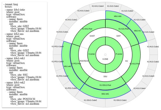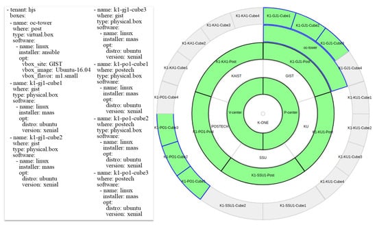 When it comes to the playground topology, two tenants respectively demand four physical boxes from two sites. In addition, one of the tenants wants a virtual box to place the Open Baton NFV orchestrator. Based on the requirements, we selected the locations of the physical/virtual boxes and wrote a playground template as shown in the left of Figure 16. The Provisioning center results in the reconfigured playground that can be intuitively visualized on the onion-ring dashboard shown in the right part of Figure 16. Among the green-colored elements, the blue-colored border belongs to the Open Baton developer, and the M-CORD developer can utilize the boxes with the red-colored border. We could properly provide collections of physical and virtual boxes to the tenants, and they could successfully achieve the research outcomes [,].