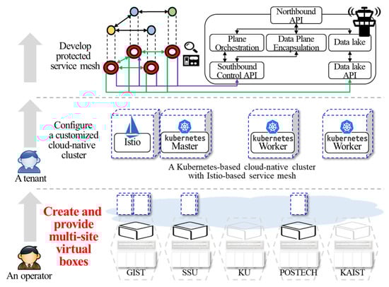Through various research, worldwide researchers have proposed cloud/edge cloud testbeds with successful examples of development use cases. The respective testbeds consider different infrastructure topologies, target service domains, and resources/tools for developers. Cumulus testbed [] gives developers a task dispatcher that can help deploy offloading services over physical resources and virtual resources of edge clouds. The Homecloud testbed [] provides SDN/NFV-leveraged edge clouds with OpenStack-based NFV-cloud controllers and SDN controllers. PlanetIgnite testbed [] provides virtual resources from distributed edge clouds to developers with a helper tool to deploy container-based services easily. These testbeds have in common that they can help tenants easily develop deployments/orchestration services for virtualized applications in different target domains. However, these testbeds are limited to providing software tools, controllers, or virtual resources that are not suited for supporting the customized configuration of cloud-native clusters. Thus, the approach of the testbeds is not well aligned to our requirements due to the differences.