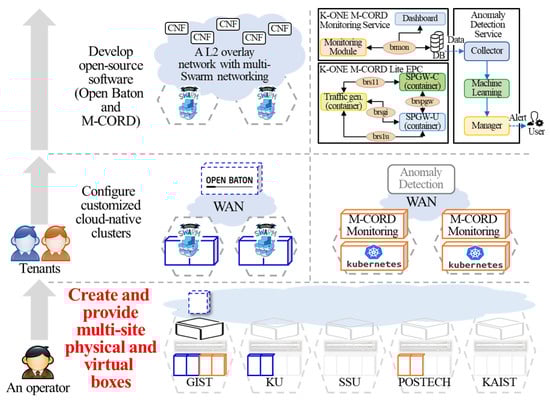 K-ONE Playground has been actively utilized to support various contribution efforts of SDI-oriented open source software projects. Figure 15 shows an example case of multi-tenant experiments that could be easily supported by utilizing the reconfigurable clusters. In the third use case, two tenants demand to utilize K-ONE Playground. A tenant focuses on developing a Docker Swarm plugin of the Open Baton framework software, and at the same time, another develops a monitoring system and anomaly detection service for M-CORD.