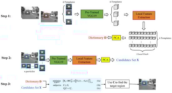 The tracking steps of the proposed STLDF for two consecutive frames (i.e., frame #1 and frame #2) are summarized in Figure 1. In the first step, local deep features of k target templates are extracted using the initial target location in the frame #1. Their top principal components are selected using PCA. The dictionary consisting of these local deep features is then constructed. The interested readers may refer to Section 3.1 and Section 3.3 for details. In the second step, local deep features of target candidates are extracted to construct in the frame #2. In the third step, local deep features of each target candidate, , is represented by the dictionary matrix in the optimization model in (1). Finally, the optimization model is iteratively solved to obtain for each target candidate using (7), (8), and (9). The best target candidate with the minimum reconstruction error is then selected as the target candidate. The tracking continues for the next frame using the previously estimated target location and templates are updated as explained in Section 3.4 until all the frames are processed.