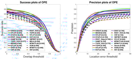 We follow standard protocols in References [,] to evaluate the performance of the proposed STLDF against other trackers. To do so, we utilize the bounding box overlap ratio and the center location error as evaluation metrics. The bounding box overlap ratio is the ratio of the intersect to the union regions of the tracking result bounding box and the ground-truth bounding box. The location error is defined as the Euclidean distance between the center of the tracking result bounding box and the center of the ground-truth bounding box. We perform one pass evaluation (OPE) experiments and display success and precision plots. OPE is conventionally used to evaluate trackers by initializing them using the ground truth location in the first frame. Success plots display success rates at different overlap thresholds for the bounding box overlap ratio. Precision plots display precision rates at different error thresholds for the center location error. To rank trackers using success plots, we calculate the area under curve (AUC) score for each compared tracker on all image sequences. The tracker with the highest AUC score achieves the best overall performance. To rank trackers using precision plots, we calculate the average precision score for each compared tracker on all image sequences at the location error threshold of 20 pixels [,]. The tracker with the highest precision score achieves the best overall performance.