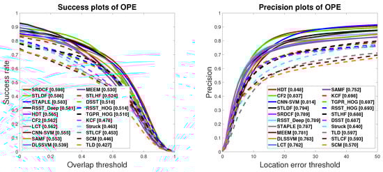 This benchmark consists of 50 annotated sequences, where 49 sequences have one annotated target and one sequence (jogging) has two annotated targets []. We evaluate the overall performance of the proposed STLDF and its two variants (i.e., STLCF and STLHF) against 29 baseline trackers in Reference [] and 17 recent trackers including MTMVTLS [], MTMVTLAD [], MSLA [] (the recent version of ASLA []), SST [], SMTMVT [], CNT [], two variants of TGPR (i.e., TGPR_Color and TGPR_HOG) [], DSST [], PCOM [], KCF [], MEEM [], SAMF [], SRDCF [], STAPLE [], and two variants of RSST (i.e., RSST_HOG and RSST_Deep) []. We present the overall OPE success and precision plots in Figure 2. We only include top 20 of the 49 compared trackers in each plot to avoid clutter and increase the readability. The value within the parenthesis alongside each legend of the success plots is the AUC score for the corresponding tracker. Similarly, the value within the parenthesis alongside each legend of the precision plots is the precision score for the corresponding tracker.