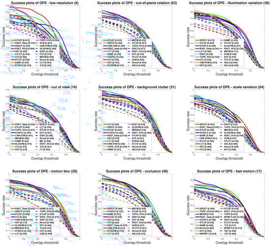 Comparing with deep learning-based trackers, the proposed STLDF outperforms or achieves a comparable AUC score than CNT (0.545) [], GOTURN (0.444) [], CNN-SVM (0.597) [], FCNT (0.599) [], DLSSVM (0.589) [], and SiamFC (0.608) []. Moreover, it outperforms or achieves comparable precision score than CNT (0.723), GOTURN (0.620), CNN-SVM (0.852), FCNT (0.856), DLSSVM (0.829), and SiamFC (0.815).