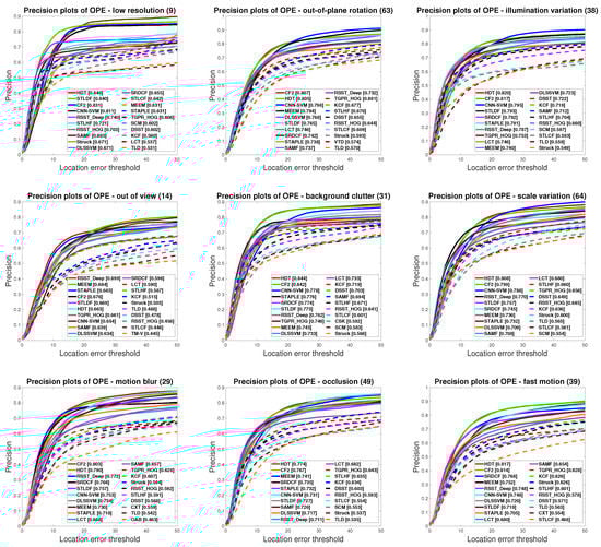 We evaluate the proposed STLDF and its two variants (STLHF and STLCF) against 29 baseline trackers in Reference [], and 15 recent trackers including DSST, PCOM, KCF, TGPR_HOG, MEEM, SAMF, SRDCF, LCT, STAPLE, CF2, CNN-SVM, DLSSVM, HDT, and two variants of RSST (i.e., RSST_HOG and RSST_Deep). Some trackers used in the experiments of OTB50 are excluded from this experiment since they do not publish their results on OTB100. Similar to the experiments on OTB50, we follow standard protocols proposed in References [,] and use the same parameters on all sequences to obtain the OPE results. We present the overall OPE success and precision plots of the top 20 trackers out of 47 compared trackers in Figure 3.
