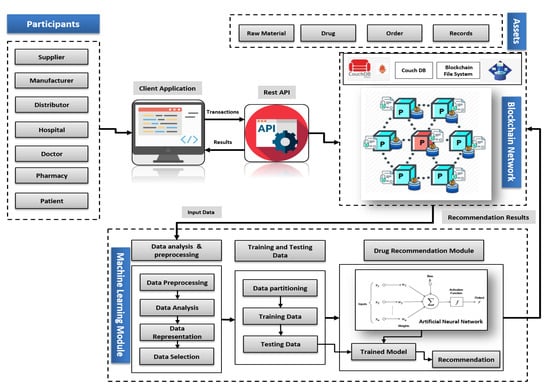 The decentralized distributed nature of blockchain technology has extended the security and privacy of the drug supply chain of the pharmaceutical industry. The complete drug supply chain management and recommendation (DSCMR) mechanism is presented with participants and blockchain network in Figure 1 in which users can manage and updates the whole supply chain activities. The data related to the users of the system suppliers, manufacturer, distributors, pharmacies, hospitals, doctors and patients are stored in the blockchain-based system. The assets of the DSCMR systems are drug, raw material, order and record repository. Each user of the system is provided with client application based front-end where they can easily perform their transaction and communicate with the blockchain network. During the whole DSCMR procedure all the relevant participants of the system can track the status of the drug delivery by using the client application. On the other hand, there is a data storage pool, which is a separate data library, also called stored-off blockchain. It is a great tool for analytics and visualization of data because visualization of data can not only be required for this system but medical-related institutes can also be used for their projects and in our system we have also used this store-off storage pool for the machine learning module and the machine learning model recommends the best drug to our customers. Moreover, system users get permission to check the complete details of drugs, raw materials and other relevant information like expiry date, price, manufacture date, etc.