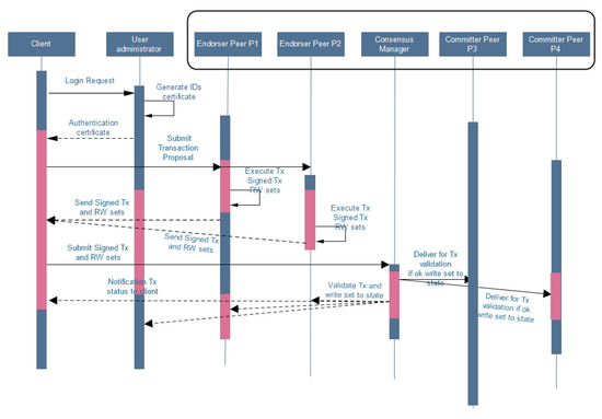This section explains the transactional procedure of the drug supply chain management system: how a transaction should be accomplished in the blockchain network is shown in Figure 4. First of all, users are given the front-end of a client application that allows the user to connect to the blockchain system using their registered credentials and can complete their transaction requests. Registering all participants in the blockchain network is the responsibility of the administrator only after which a user may be able to perform the transaction. In order to submit a transaction proposal in the blockchain network, the user login on the client application and submits his transaction request using the registered credentials. After that, the transaction proposal is sent to all the peer nodes. These peer nodes are divided into two categories; either committers or endorsers. The responsibility of the endorsers is to execute or sign the transition proposals and gives the approval if it is valid and fulfill the smart contract criteria otherwise deny it. On the other hand, committer peers are to validate the results of the transactions before writing it into the transaction block of the ledger. Moreover, in order to understand the difference between these two kinds of peers is actually you can say that endorser peers are the special kind of committer peers who holds the predefined smart contract. Furthermore, these endorser peers execute the smart contract of requested transactions in their own simulated environment before updating to the ledger when they receive the transactions proposal. The endorser peers will extract the read and written data while executing the transaction in the simulated environment which is known as the RW set. In the read data of the RW set which contains the information of world state before transaction and on the other side written data is actually what is written in the world state after executing the transaction in a simulated environment. After that, the endorser peers will return back the signed transaction to the client application with RW sets. The client again submits the signed transaction with all RW sets to the consensus manager and it will deliver the transaction into the committers nodes; and also ordered the data into a block. Afterward, the committers nodes validate the transaction by matching the current world state and then transaction data is written into the ledger. Finally, the ledger is updated according to the written data. In the end, committer peers will send the notification to the client for transaction status either submitted or not. The communication of client application with blockchain network is established with the help of REST API and software development kit (SDK).