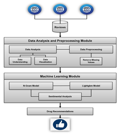 In this section, we are going to explain the models used for the recommendation of drugs in our proposed system; natural language processing model (NLP) N-gram for predicting the probability of a word in a sequence [58], LightGBM for reducing the low gradient features and sentiment analysis dictionary adding for the purpose of emotional analysis [59].