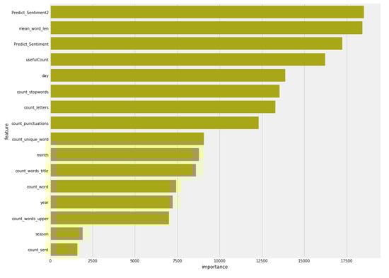 In the GOSS model, small gradient data instance will be excluded because only data instances with high gradients are important for the estimation of information gain. A large amount of data portion is eliminated for training the model. Hence, the data instance with a low gradient will not affect the model estimation accuracy. In our case, only data instances are used with high gradients for information gain. However, the GOSS can provide accurate estimation with small data size. On the other side, EFB is used for feature reduction, by grouping mutually exclusive features together. In EFB the greedy algorithm can be utilized to reduce the features in an effective manner without affecting the accuracy of information gain. Microsoft named these GOSS and EFB based implementations as lightGBM. Lastly, lightGBM is the more fast and accurate model than the other GBDT. They claim that it is 20 times faster than other GBDT models [59]. Some important features extracted by lightGBM model are shown in Figure 9.