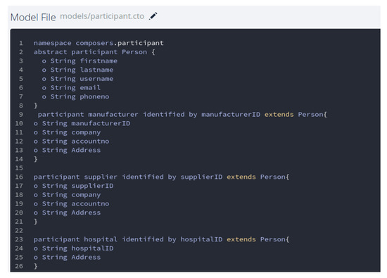 The Hyperledger composer is the best open-source option for the development of blockchain-based applications. One of the major features of this network is to design the smart contract for the business network easily and efficiently. The smart contract in the Hyperledger-based business network consists of four major components; model for defining the participants, script for business logic, access control rule for permission or security and queries for accessing the ledger database. The participants run the business network and each participants have some assets and can perform transactions. The participants of our proposed system are suppliers, manufacturers, distributors, pharmacies, doctors, hospitals and patients. Particularly, the assets of our system are drug, raw material, orders, record repository of system. The participants of the system are defined in the business network is shown in Figure 10. On the other side, transactions of the system are defined during the development of smart contracts, how a user can interact with assets, performs transactions, events, participants involved in the private network, more specifically each and every activity is defined during smart contract development. The event functions are also parts of the transaction process function and execution procedure is similar to the transaction. Moreover, some of the defined transactions and events of our system are presented in Table 3.