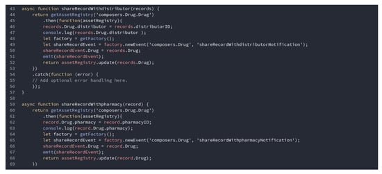 There are four major things to define while building blockchain network with Hyperledger fabric: model file, for defining participants, script file for defining smart contract functions, access control rules file, for defining rule and query file, for performing some actions like select, update, etc. Figure 11 represents the one of script file function which is defined for performing a transaction. this transaction function is for updating the drug detail like expiry date, price, manufacturing date, etc. This script file contains the functions of the transactions related to create, delete and update the assets as well as participants in our blockchain-based DSCMR system. We used JavaScript language for writing these transaction functions while modeling the smart contract. The two transaction functions are presented in this diagram sharerecordwithpharmacy and sharerecordwithdistributors.