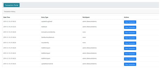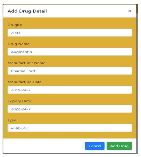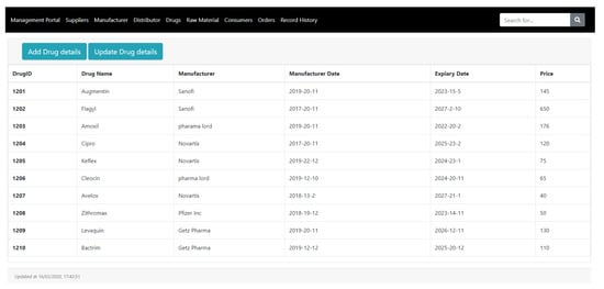In this part, we explain the working of a DSCM system while communicating with the blockchain network. As we already discussed, the client application user interface is provided to each participant of the system where they can start their transaction after validating the identity. The client application communicates with the blockchain network by using a REST server composer in which each request is sent through the REST server and will store the transaction in the blockchain network. The client web application portal is shown in Figure 13 for drug management where manufacture can add, update and delete the drug details in the blockchain network. Afterward for adding new as well as available drug data manufacturer is given a web form to fill the entries and store the filled data in the blockchain network. For adding drug details in the blockchain system using this web form DrugID, Name, company name, manufacture date, expiry date, types are needed to be shown in Figure 14. The manufacturer also shares the drug record data repository with the other participants like distributors, pharmacies, hospitals and doctors as well. The drug management portal will allow users to perform create, read, update, and delete (CRUD) operations with the help of the application user interface. The users can also update the information on the existing drug by sending the update request through the user interface to the blockchain network [64].
