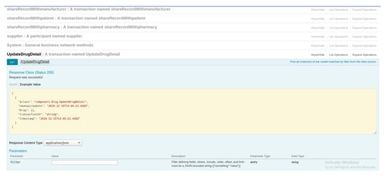 Figure 15 illustrates the Hyper-ledger REST server composer front end where we can also perform queries directly. The communication between client application and blockchain network is done through this Hyper-ledger REST server composer. Moreover, the user can direct queries to this REST server for the transaction to validate; it shows the metadata of the transaction. In this Figure 15, the updatedrugdetail query is instantiated from the client application to the REST server for transaction submission. The response of the REST server is also shown in the JSON data format which contains the metadata of the updatedrugdetail transaction.
