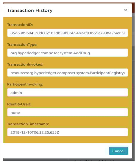 Similarly, Figure 16 shows the previous transaction history performed in our proposed blockchain-based system. This portal shows all the activities done through the web application to the blockchain network; either it should be a transaction, add some participants, assets to the system. The attributes of this history portal represent the time and date of the transaction activity performed, type of the transaction and the participants of the system who is involved in this transaction to perform. This portal shows the log of all the transactions performed in the blockchain network. From this history portal, users can see the detail of each transaction but did not able to alter the value; it is protected from the blockchain network. The user can also view the transaction detail by just clicking at view transaction button: a view only web form with transaction detail is presented in Figure 17.