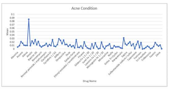 This section contained the prediction results generated by our proposed machine learning-based drug recommendation system. Figure 18 illustrates the drug recommendation results from our proposed system on the basis of specific conditions. The drug name with their mean values for specific acne condition is presented. Our system has the ability to successfully recommend the top-rated and best medicine to the customers of the system. However, customers can easily query at our system for the recommendation, which drug is best for pain, blood pressure and any other related diseases condition. The patients can directly query to our system by using our client application and other pharmaceutical customers like pharmacists, doctors and hospitals can also use this system using their credentials.