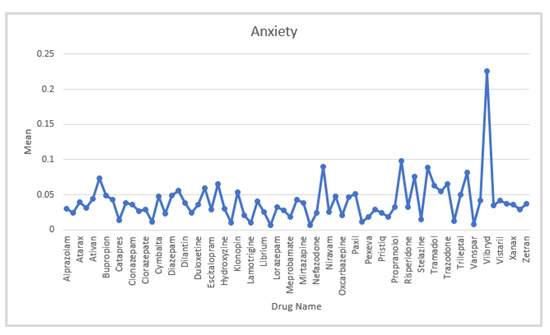 The drug recommendation results for anxiety conditions are presented in Figure 20, where the drug name and mean values of that drug are plotted on x and y-axis. Customers of the system can perform this operation by using our client application front end and search for the best medicine. From the back-end, our trained model can predict the drug according to its training. However, the best recommendation results for anxiety or any other condition will be provided to customers.