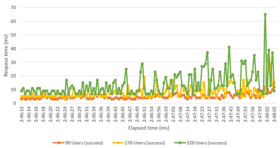 Three different user groups have been used and compared to test the response of our blockchain network. We have run the simulation for a period of 100 ms to test the system as shown in Figure 22. The response time starts to increase as users grow in the network. We have tested the performance of the system by using 90 users for the first time, 270 users for the second time and 320 users for the third time. It can be seen that there was no increase in system response rate for the first two user groups but when using the third user group there was a slight increase in system response. To some extent, the system is also performing stable as users grow.