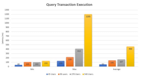 Figure 23 illustrates the execution of query transactions in the proposed system with minimum, maximum and average latency. Four different user groups are used to test the latency of the blockchain network while querying. These users groups contain 45, 90, 270 and 540 users, respectively. As shown in the Figure 23, in the first scenario with 45 users, the average latency is 53 ms, in the second scenario with 90 users, the average latency is 145 ms, in the third case with 270 users, the average latency is 167 ms and in the last case with 540 users, the average latency is 460 ms.