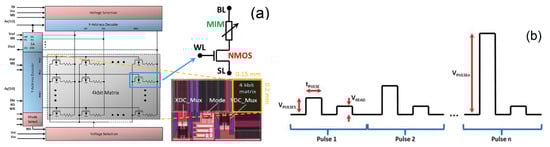 Micrograph and block diagram of the 4 kbit memory chip and schematic of the 1-transistor-1-resistor (1T1R) cells integrated into the array (a) []. Schematic illustration of the voltage waveform of the incremental step pulse with verify algorithm (ISPVA) (b) [].