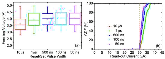 The electrical characterization of the RRAM samples was carried out by using an ad hoc designed memory tester, namely, Active Technologies RIFLE SE. The ISPVA approach is implemented in this set-up by means of software routines programmed in LabVIEW. In such a programming approach a sequence of increasing voltage amplitude pulses is applied to the samples (Figure 1b) []. During the forming and set operations the sequence of pulses is applied on the bit line (BL), while along the reset operations this sequence is applied on the source line (SL) (Figure 1a). Just after applying one programming pulse a read-verify procedure is carried out by using a read-out pulsed voltage of 0.2 V on the BL in order to test the resistive state of the RRAM samples programmed. Through forming and set operations, the LRS is achieved when the read-out current measured overcomes a target value of 30 A. In order to control the maximum current that flows through the RRAM device, a voltage value of 1.4 V is imposed on the word line (WL). Through reset operations, the HRS is achieved when the read-out current measured cross down a target value of 5 A. The voltage value applied on the WL in this case is 2.7 V to minimize the transistor series resistance. In this study, five different programming pulse widths were used, namely, 10 s, 1 s, 500 ns, 100 ns and 50 ns (the physical limit imposed by the characterization set-up). The read-out pulse width was fixed to 1 s (also imposed by the set-up) for all experimental tests.