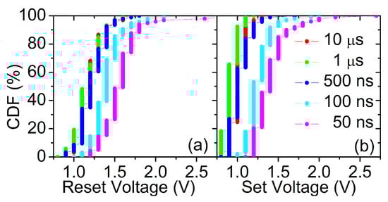 Afterwards, 1k reset/set cycles were performed on every batch of 128 RRAM devices in order to test the switching endurance for every pulse width considered. As shown in Figure 3, it can be concluded that the voltage amplitude required to switch the RRAM devices increases when the programming pulse width is reduced [,]. This increase is even more noticeable when pulse widths of 100 and 50 ns are used. For these specific values, it does not only take place a shift in the mean value of the CDF to higher voltage values, but also a tail appears at the top end of the CDF. In summary, by reducing the programming pulse width the voltage amplitudes and, in consequence, the number of pulses required by the ISPVA are increased.