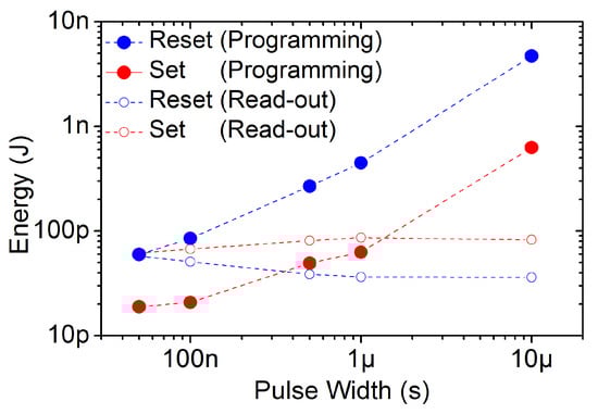 In Figure 4 the energy consumption associated to programming and read-out pulses is plotted independently for both reset and set operations. The energy consumption of the programming pulses is strongly impacted by the pulse width employed. A reduction of more than one order of magnitude takes place by narrowing the pulse width from 10 s to 50 ns: from ∼5 nJ to ∼60 pJ during reset operations and from ∼630 pJ to ∼19 pJ during set operations. The amount of energy required to reset a RRAM cell is clearly larger than that required to set it (Figure 4). This result is in line with previous studies, which suggest a positive feedback (between Joule heating and the current increase) during the set operation and a negative feedback (between the gap size in the CF and the current decrease) during the reset operation []. Furthermore, the energy consumption coming from the read-out operations (Figure 4) remains almost constant regardless the programming pulse width used considering that the read-out pulse width is kept constant to 1 s. In conclusion, 50 ns programming pulse width seems to be the best option in order to ensure low-energy switching. However, the voltage tail present in the CDF depicted in Figure 3 for this pulse width can make the switching operation not reliable enough for real memory scenarios. As a result, a trade-off remains to determine which programming pulse width guarantees the most reliable and lowest-energy operation.