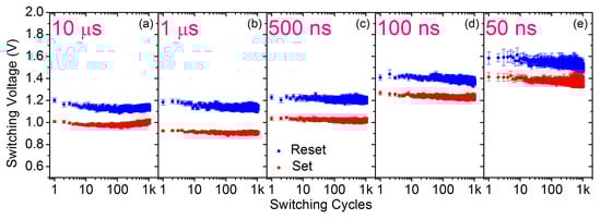 Mean and dispersion values of switching voltages for reset (blue) and set (red) operations during 1k endurance cycles for every programming pulse width: 10 s (a), 1 s (b), 500 ns (c), 100 ns (d) and 50 ns (e).
