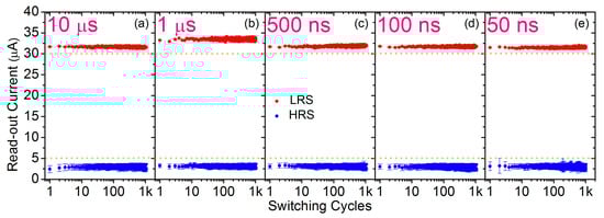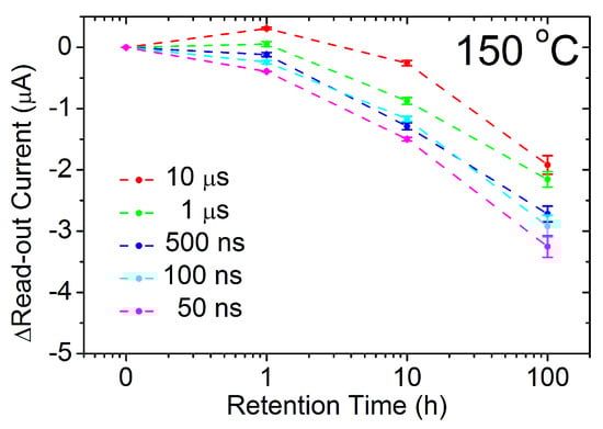 In conclusion, by using shorter programming pulse widths in order to accomplish fast and low-energy switching operations no significant endurance or data retention issues are reported. Such a good performance achieved regardless the pulse width employed could be explained as follows. According to Balatti et al. [], there is an optimal combination of the programming pulse width and the voltage amplitude in order to achieve the best switching endurance. The step-by-step approach implemented in the core of the ISPVA leads to a dynamic tailoring of this combination of the two programming parameters (see Figure 3) every cycle. Thus, the best endurance performance can be achieved whatever is the pulse width selected within the studied range. Regarding retention performance, Chen et al. [] concluded that the stability of the CF is really impacted by the pulse width employed during the programming of the RRAM cells, while in the current study the impact was found to be almost negligible (see Figure 8). This difference could be attributed to the lack of SiN encapsulation of the MIM stack in [], which has been reported as an effective strategy to suppress the chemical interaction between the MIM cell and the environment, strongly reducing, hence, the retention issues [].