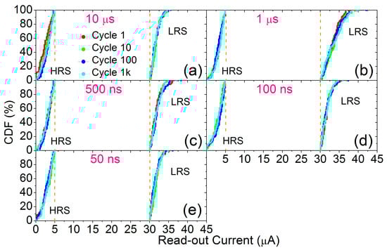 CDFs of read-out currents measured just after the reset (HRS) and set (LRS) transitions during 1k endurance cycles (logarithmically sampled: 1, 10, 100 and 1k cycles) for every programming pulse width: 10 s (a), 1 s (b), 500 ns (c), 100 ns (d) and 50 ns (e).