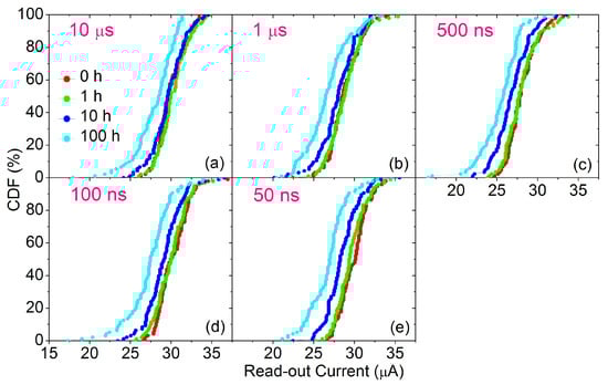 CDFs of read-out currents sampled after 0, 1, 10 and 100 h of annealing at 150 °C during the retention test for every programming pulse width: 10 s (a), 1 s (b), 500 ns (c), 100 ns (d) and 50 ns (e).