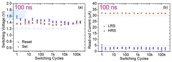 Mean and dispersion values of switching voltages (a) and of read-out currents (b) gathered just after the reset (blue) and set (red) transitions during an endurance test of 200k switching cycles on 128 RRAM devices by using a programming pulse width of 100 ns.