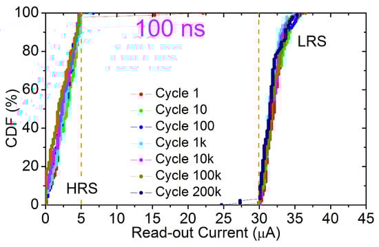 CDFs of read-out currents measured just after the reset (HRS) and set (LRS) transitions during an endurance test of 200k switching cycles on 128 RRAM devices by using a programming pulse width of 100 ns.