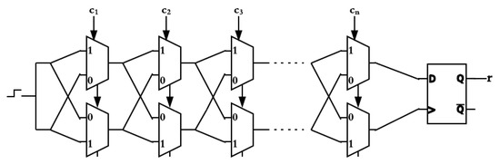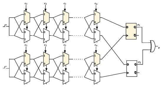 Since the design of both XOR PUF and DAPUF consist of multiple arbiter PUFs, it is essential to understand the structure of an arbiter PUF design. The initial design of arbiter PUFs that was introduced in [15,16] is illustrated in Figure 1. It consists of two parallel paths on which electric signals (input challenge) race against each other simultaneously through n-stages to reach the Arbiter. Each stage contains a pair of multiplexers and the challenge bit decides which path will be taken by the signal. The final stage is connected with an arbiter using two latches from top and bottom paths. The signal that reaches the arbiter input bit first will take the value of 1, otherwise 0. The response in n-stage arbiter PUF could take different paths. However, it turns out that the output of arbiter PUF could be predicted using machine learning attack depending on a model of additive delay model [6] that could be represented as a linear specification problem, which makes it vulnerable against machine learning attacks.